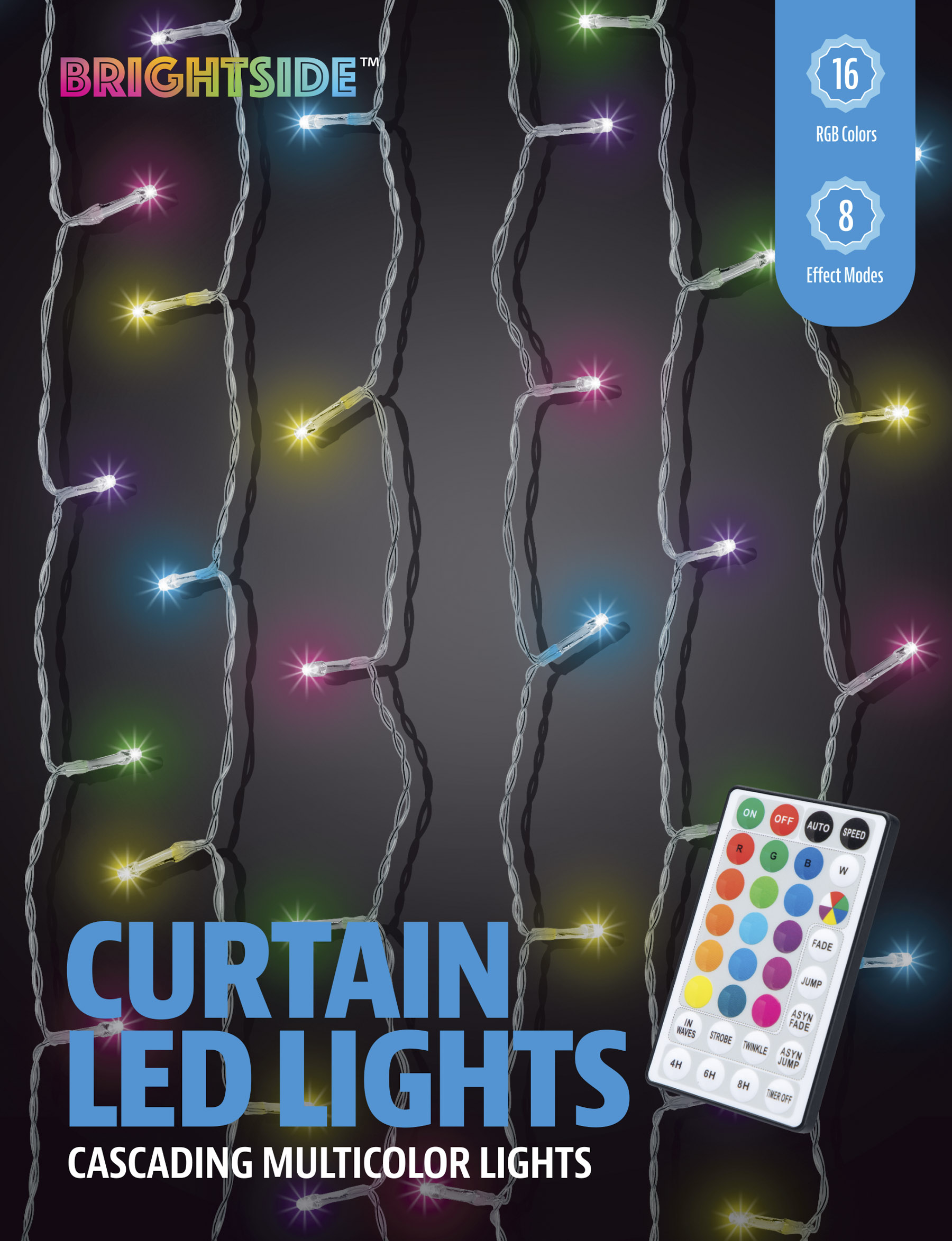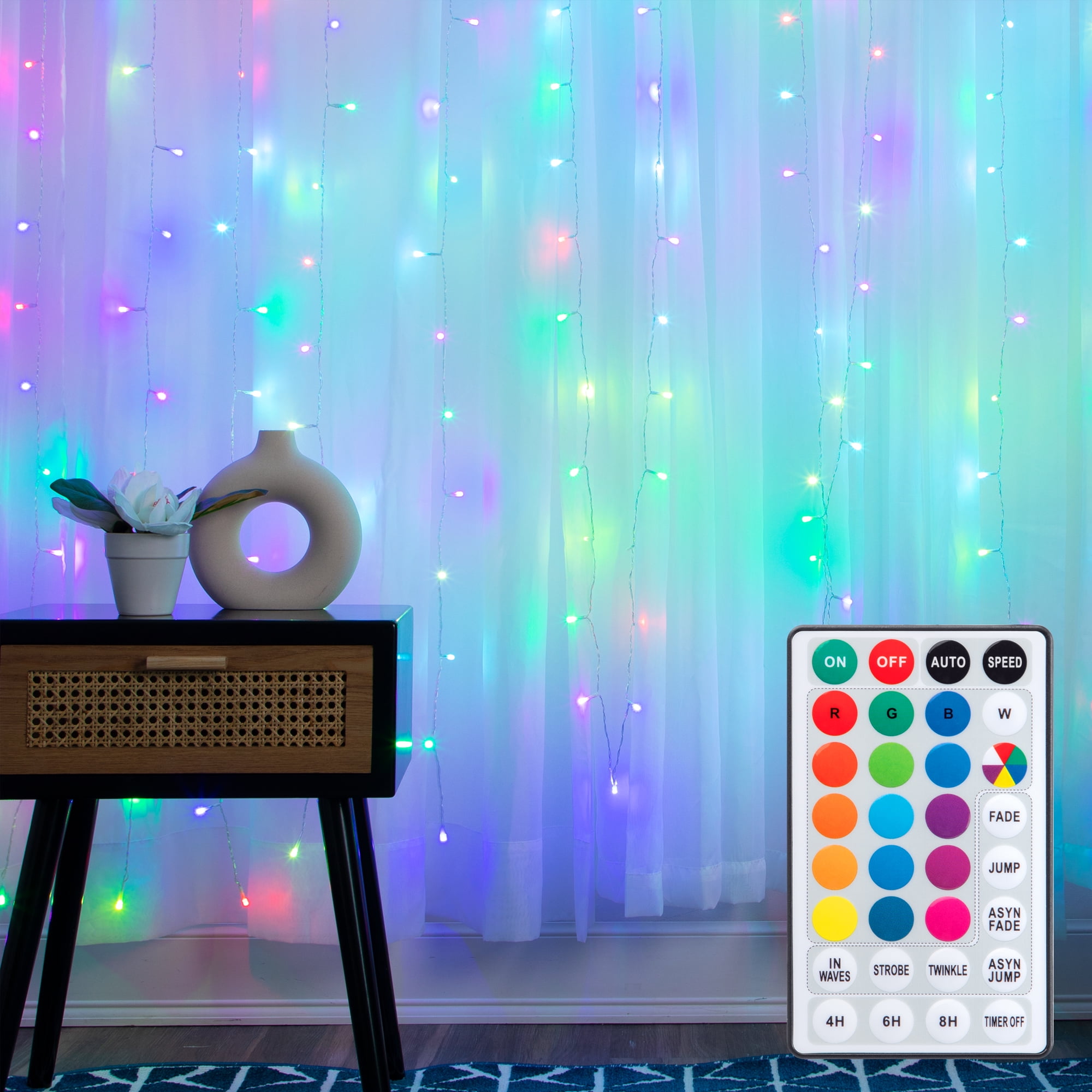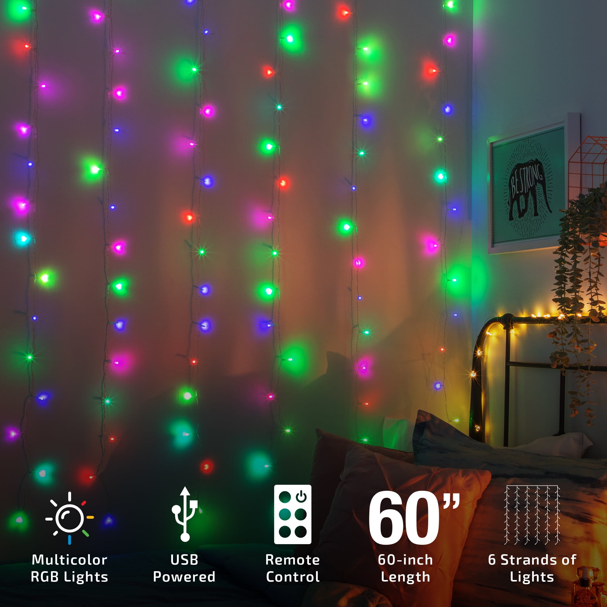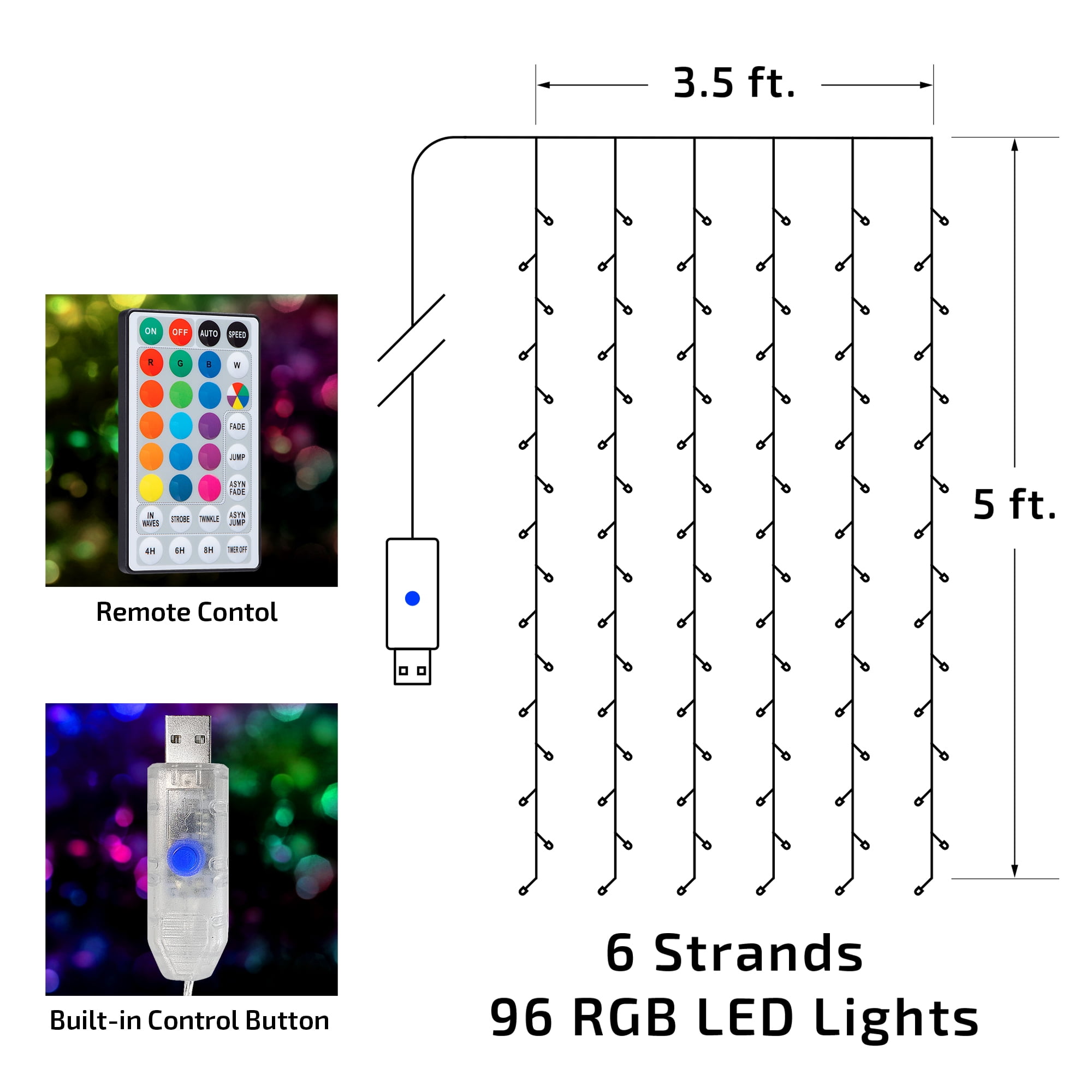 96 Multicolor Indoor RGB Lights Remote Control 16 LED Colors + 8 Effect modes 6 Strands – 3.5ft. Wide x 5ft. Tall Built-in On/Off Timer USB-Powered