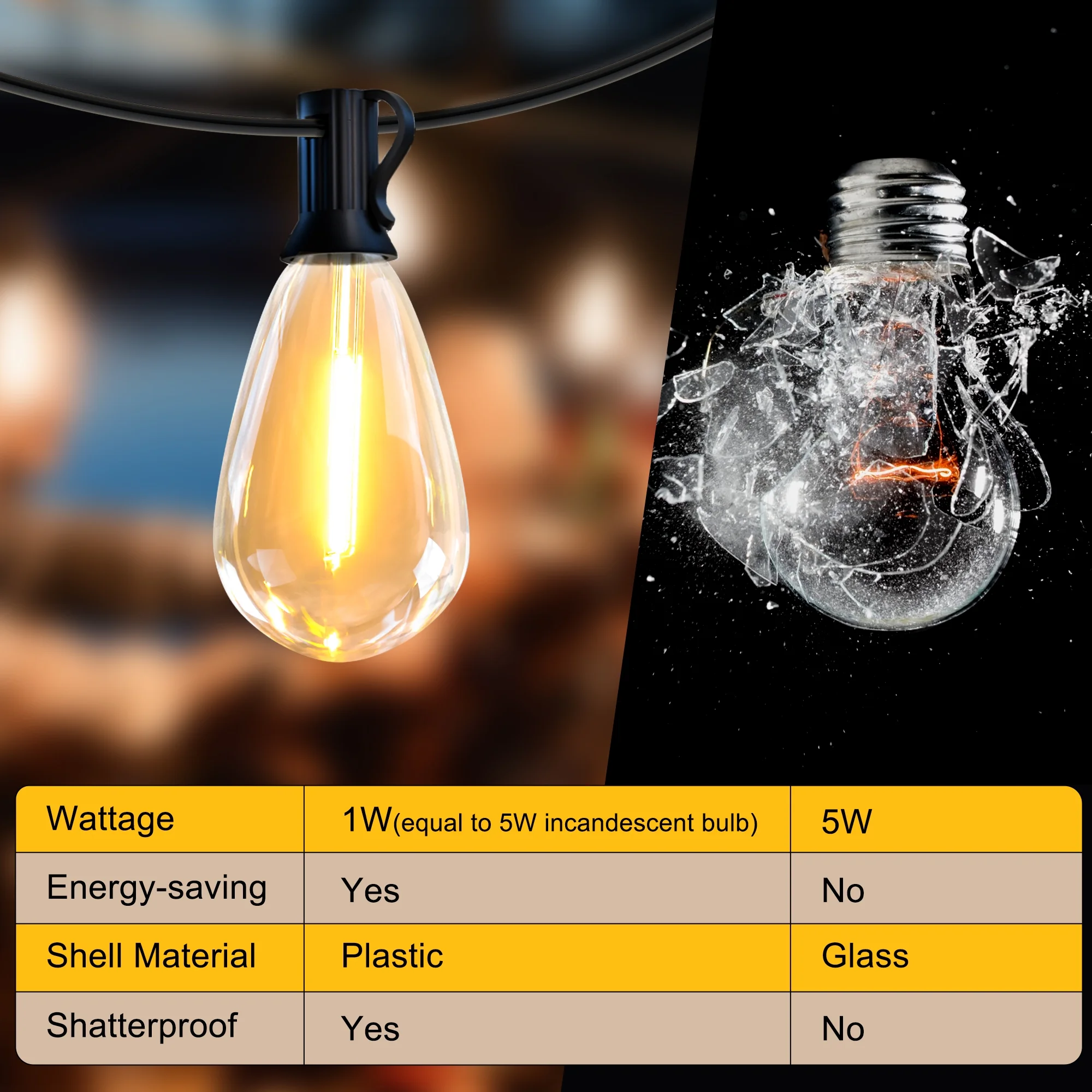 & Free ShippingThe warm white glow of LED outdoor string lights provide a perfect decoration and lighting for your outdoor parties and events. The shatterproof and waterproof bulbs are designed for outdoor use. Create a wonderful atmosphere for backyard, house, bistro, patio, etc. DAYBETTER outdoor string lights are the perfect decorative lights for patio, backyard, garden, Bistro, party, etc. we offer 1-year warranty for your string lights. If you have any trouble with this string light, We will offer for help. Power Source: Electric Material: PVC+PE+Copper