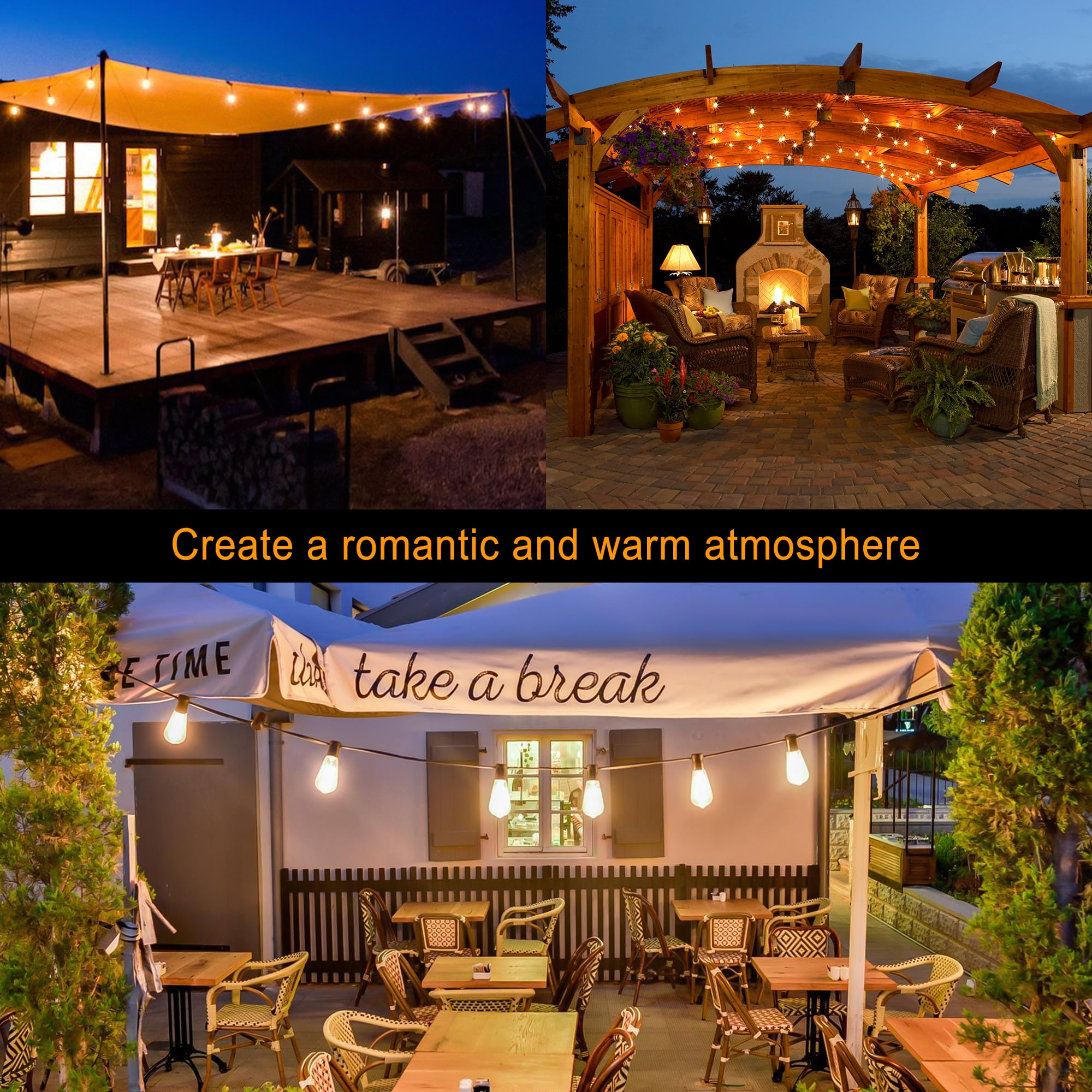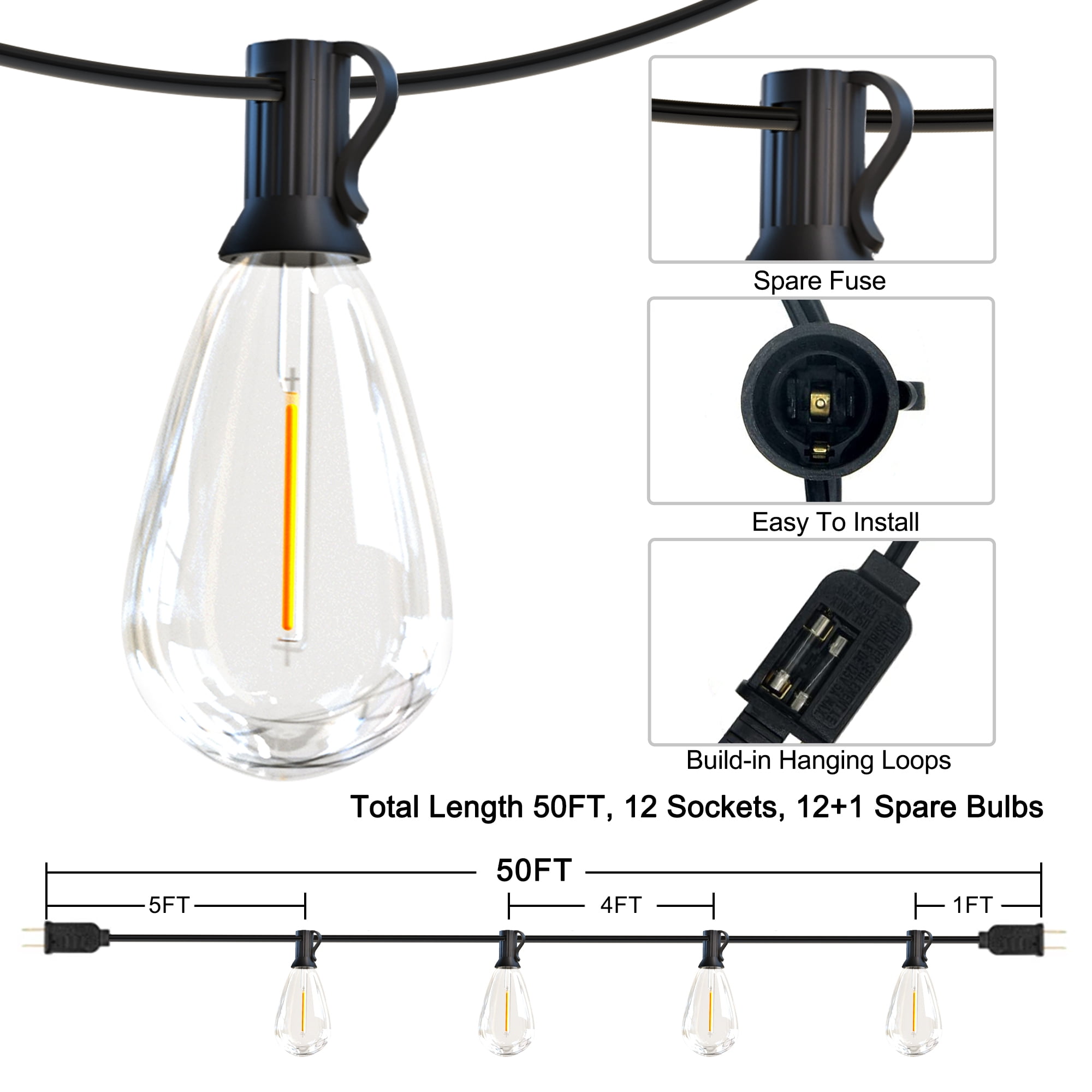 Vintage Style – 2700k outdoor string lights cast a warm light that can create a cozy, romantic atmosphere and make you feel relaxed in your backyard after a busy day at work. Suitable for patios, backyards, decks, gardens, markets and many other events. Save Energy – Compared to incandescent bulbs, these functional LED exterior string lights consume less electricity and are more environmentally friendly. With an average lifespan of 30,000 hours, you’ll reduce the frequency with which you have to replace bulbs and save money. Waterproof and Shatterproof – The bulb is made of waterproof material for all-weather protection, no need to worry about rainy days. This S14 LED outdoor string light bulb is also made of plastic, they are more resistant to shattering than traditional incandescent glass bulbs. Easy to Install -The string lights indoor sockets are available to fit any S14 E12 bulb, which allows you to DIY the string light freely. Each socket comes with a hook for you to hang the light on an outdoor wall, fence, railing or pole. Professional Services – We are committed to providing customers with the best product quality and shopping experience, a 12 months comprehensive warranty and 100% satisfaction for outdoor string lights. Item Weight: 1.5 pounds Package Dimensions: 8.62 x 8.58 x 3.7 inches