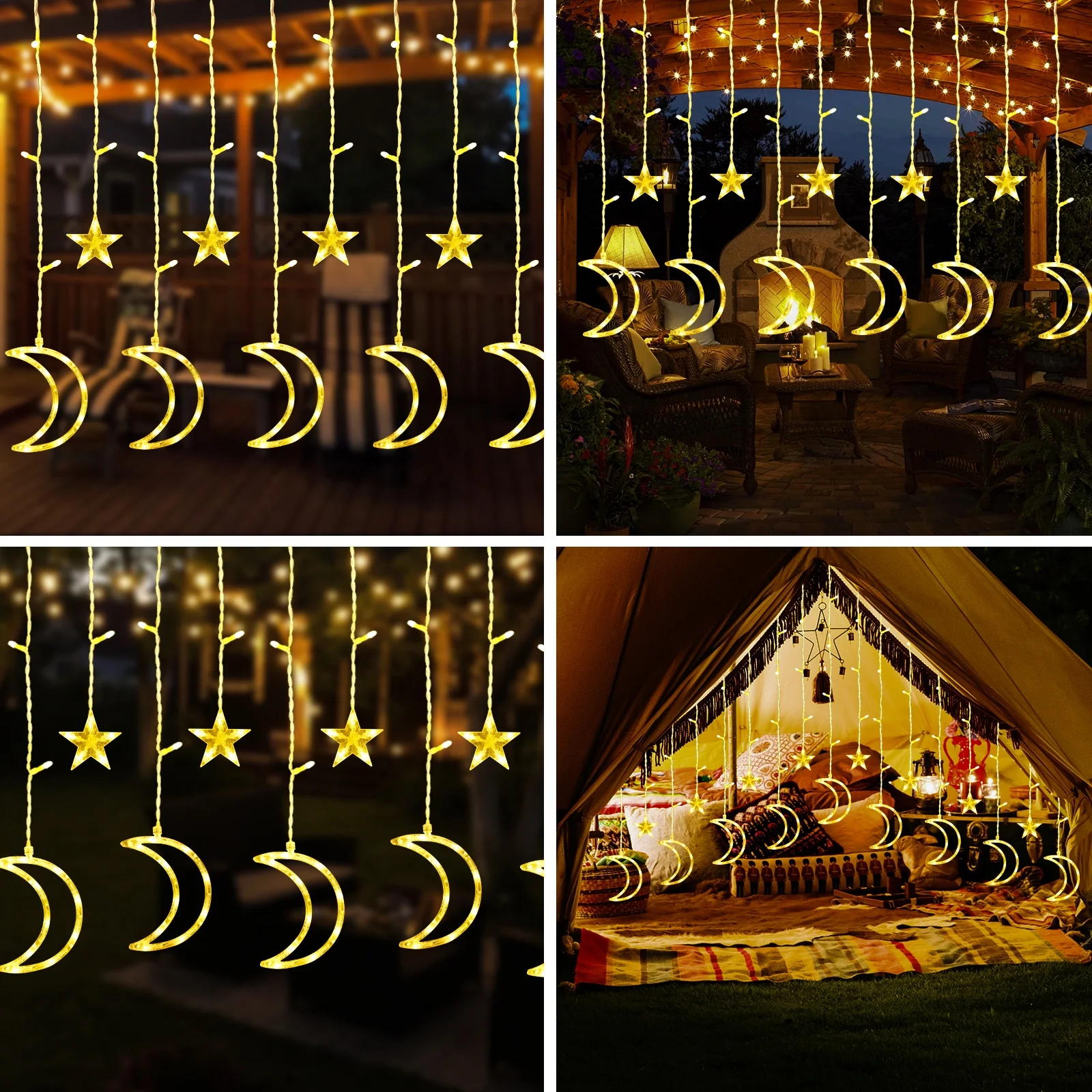 Qoosea 120 LED Curtain String Lights, Star and Moon Lights Fairy Lights, String Hanging with Remote for Bedroom Birthday Wedding Christmas Party Garden Indoor Outdoor Decoration