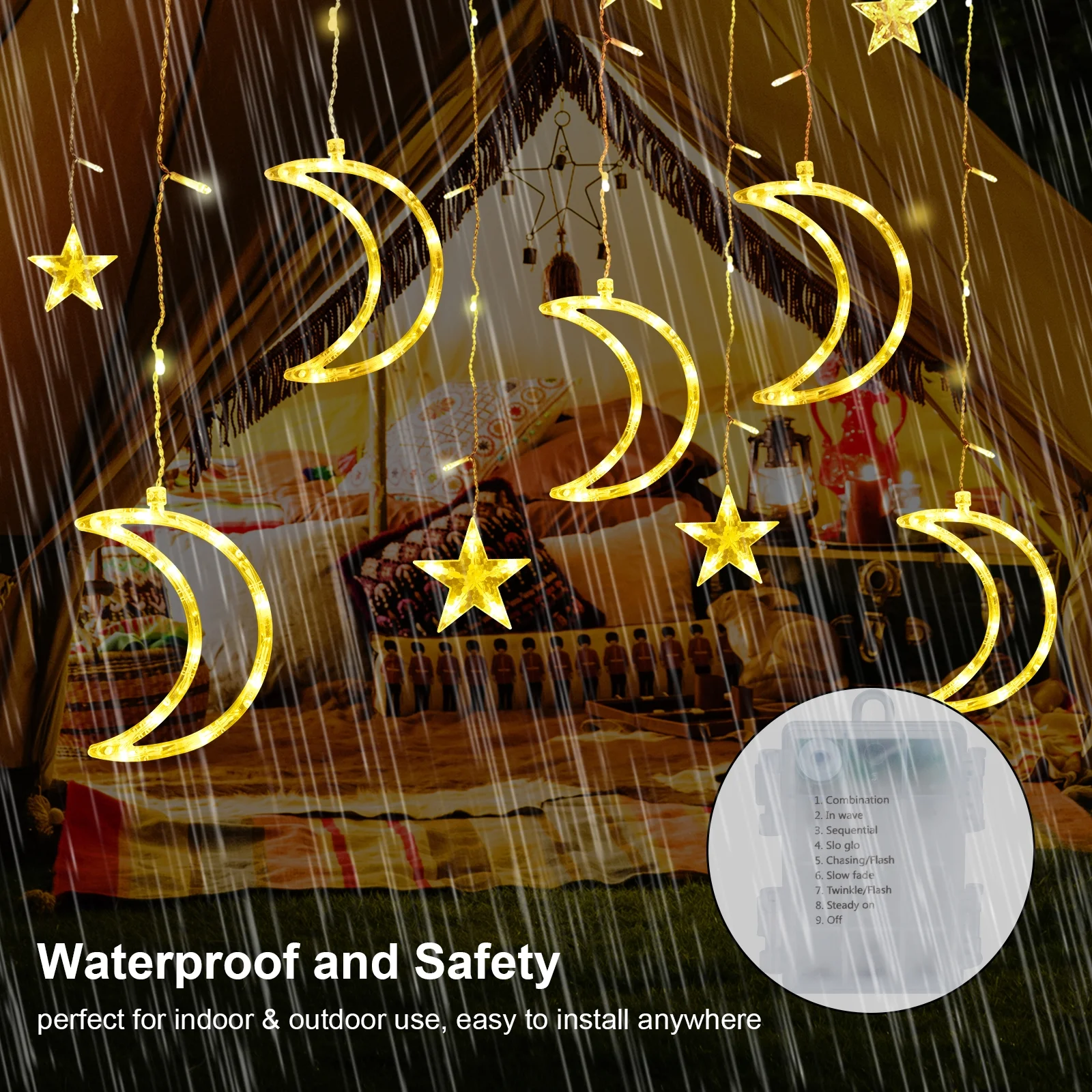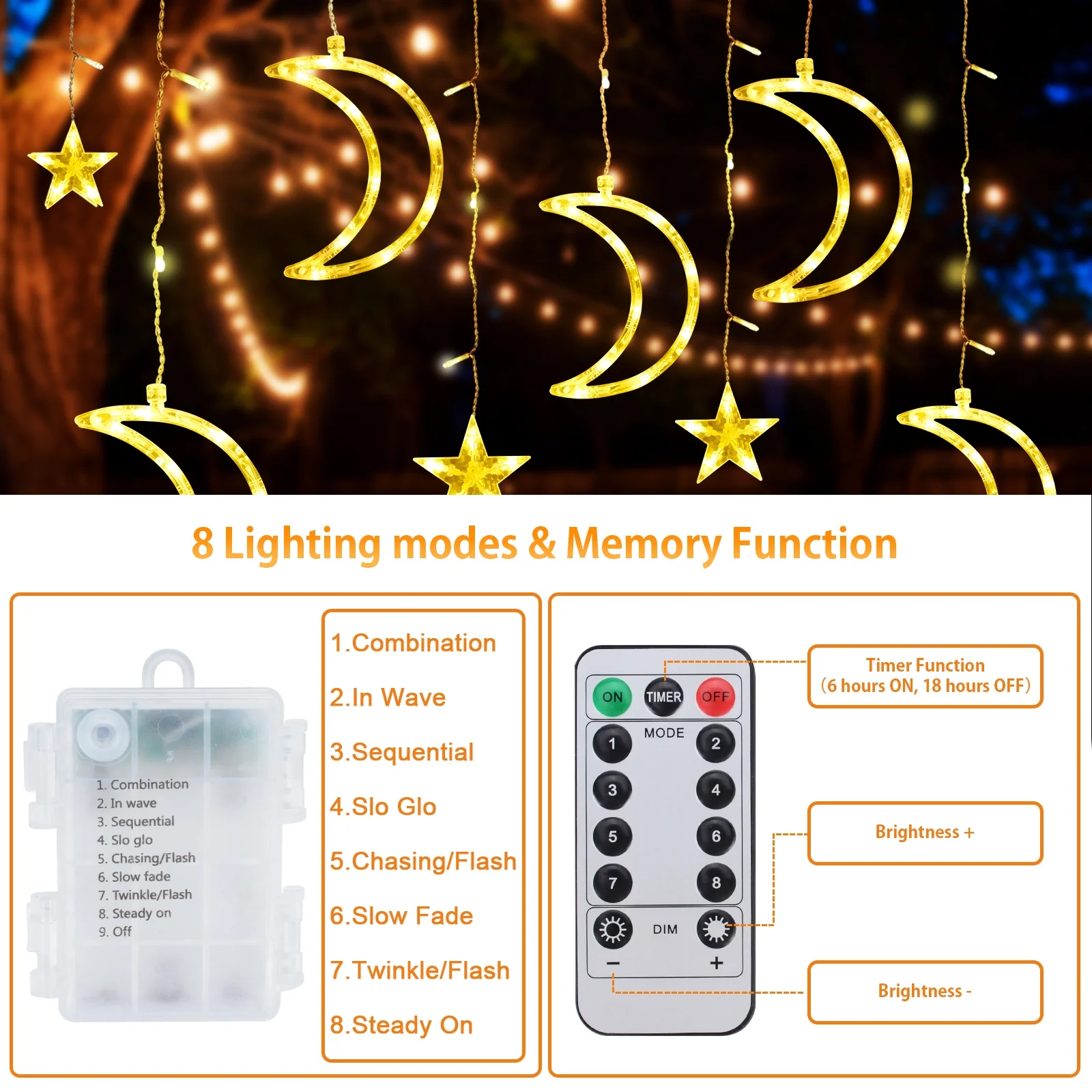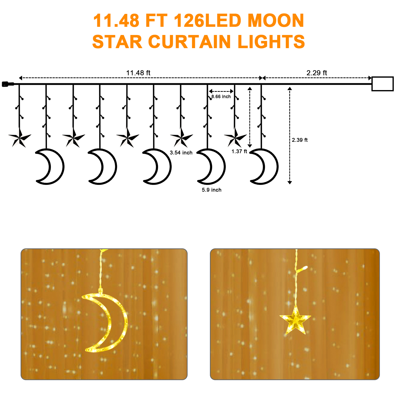 & Free Shipping120 LED Curtain Lights, Fairy light curtain Moon Star Window Fairy String Lights, Star and moon lights string Hanging Lights with Remote for Bedroom Backdrop Wedding Party Garden Indoor Decoration. Star and moon shape curtain lights are an alternative to small fairy lights. They are perfect Christmas lights to have at home because of the no heat, no radiation, low consumption and high safety nature that adds stunning visuals to the home indoors and outdoors. Great for windows, pergolas, bed frames, and anywhere you want a so-called “wall” of lights to will provide a powerful, widespread lighting. It will brings immense look to home indoors and joy in children while assembling LED lights on Christmas trees, staircase, doors, and windows. 126 led lights (6 big moons and 6 small stars) warm light