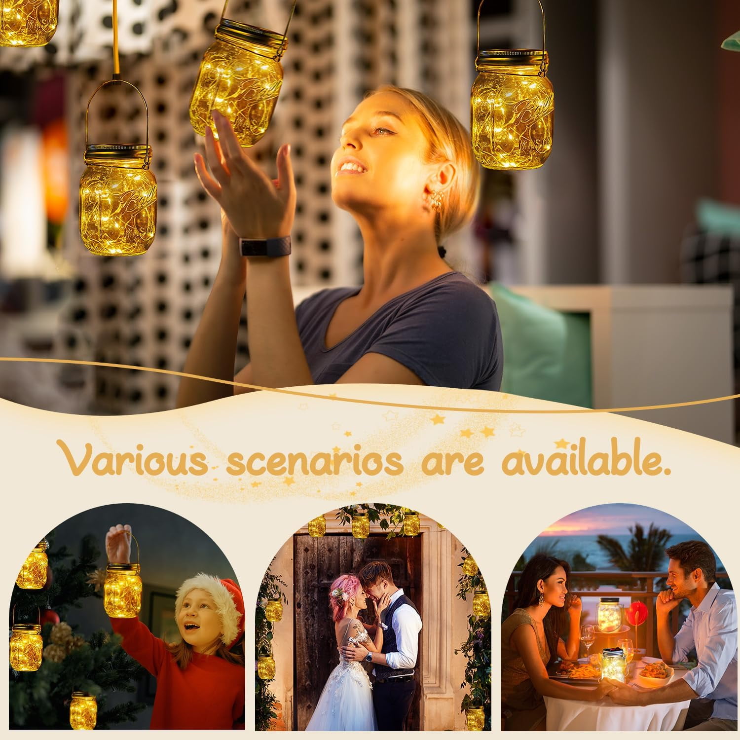 Waterproof Design – The solar powered mason jar lights are waterproof and can be used both indoors and outdoors. Long Battery Life – The lights can last 8-12 hours at night after being charged for 5-8 hours in direct sunlight. Automatic On/Off – The lights turn on automatically at night and turn off during the day when exposed to sunlight. Solar Power – The lights are powered by a solar panel and require no external wiring or AC power source. Decorative Accent Lighting – The warm white LED lights add a soft glow to gardens, weddings, balconies, and outdoor spaces.