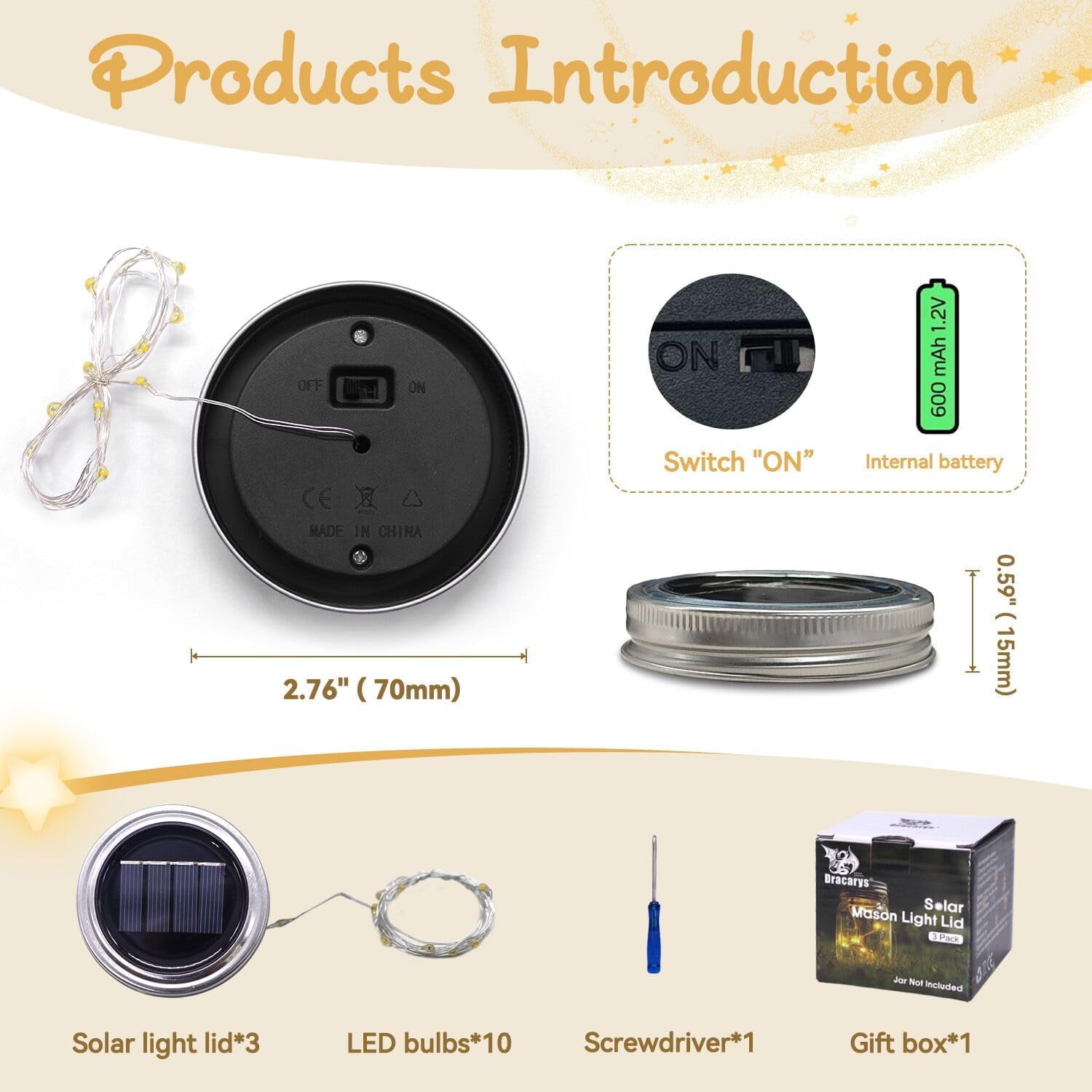 & Free ShippingWaterproof Design: The solar powered mason jar lights are waterproof and can be used both indoors and outdoors. Long Battery Life: The lights can last 8-12 hours at night after being charged for 5-8 hours in direct sunlight. Automatic On/Off: The lights turn on automatically at night and turn off during the day when exposed to sunlight. Solar Power: The lights are powered by a solar panel and require no external wiring or AC power source. Decorative Accent Lighting: The warm white LED lights add a soft glow to gardens, weddings, balconies, and outdoor spaces. Product Detail Each string light has 10 LED bulbs, solar charging powered. After fully charged in the sun for 5-8hours, the light could last for 8-12hours. For first time use, please charge longer time. The solar lids fits into most regular mason jars. Simply place the lid on the jar. Each lid has a built-in sensor so that it automatically turns on in the evenings. The switch is under the lid Specification Material: Plastic and metal Lid size: Dia. 2.76inch Solar charge: Including 1pc AAA rechargeable battery, 1.2V, 600mah Packaging White paper box packaging 3pack mason jar lids (do not including the jar) Suit for regular jar dia. 2.76 inch mason jar Packing size: 3.9 x 3.15 x 3.15 inch Packing weight: 0.37 lb/set